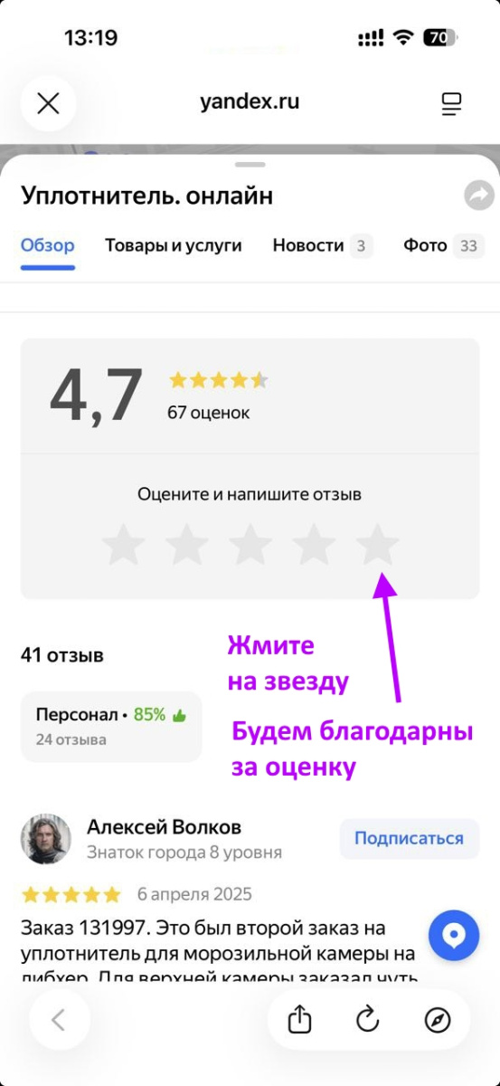 https://yandex.ru/profile/130876944025/ или https://yandex.ru/maps/org/uplotnitel_onlayn/130876944025 (в Картах Яндекса)41 отзыв + 67 оценок (на 19-02-2026)ссылка на скрин как сделать отзыв https://уплотнитель.онлайн/files/images/otzyv_kak_0.jpg